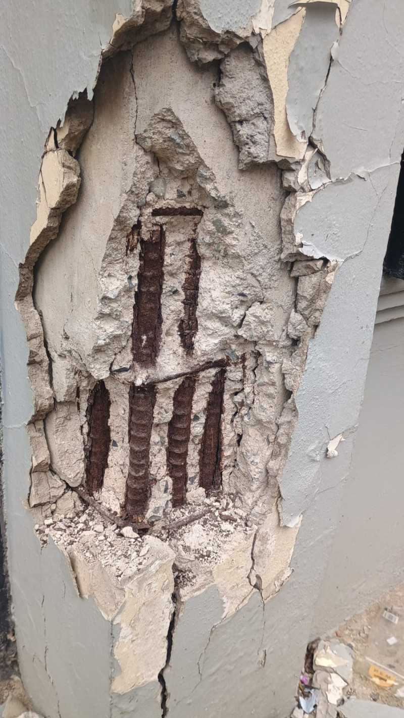 “Esto podría combinarse ante la eventualidad de un pequeño evento sísmico, que no necesariamente debe ser de alta magnitud, lo que puede ir agravando porque ya la columna y los puntos a un metro más o menos del suelo se ve el franco deterioro y la mala calidad del hormigón”, expresó Vargas.